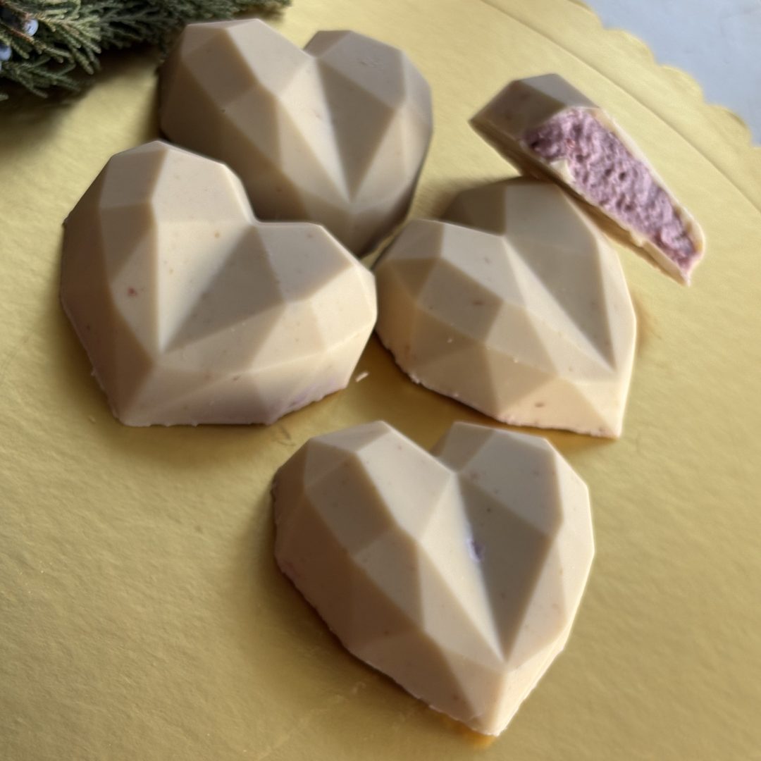 Кристални сърца с малинов пълнеж и бял шоколад
