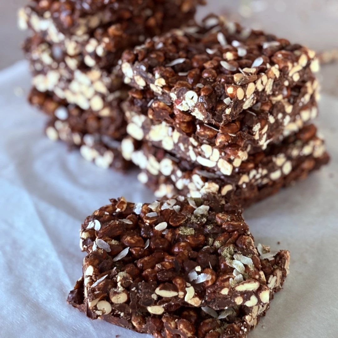 Състав: бадеми*, червена боровинка, бяла чиа, стафиди, лешници*, червена киноа, фъстъци*, слънчоглед, зърнени храни*, пшеничен зародиш*, черен веган шоколад